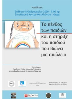 «Ανακοινώνεται η διοργάνωση ημερίδας  με θέμα το πένθος στα παιδιά και τη στήριξη του παιδιού που  έχει βιώσει μια απώλεια.  Οι εισηγητές της εκδήλωσης προέρχονται από το Συμβουλευτικό κέντρο της «Μέριμνας» τον πλέον  αναγνωρισμένο φορέα  στη στήριξη του παιδιού και της οικογένειας  στην αρρώστια και τον θάνατο. (κάντε κλικ στον σύνδεσμο Μέριμνα   για να ενημερωθείτε για τη δράση της ).