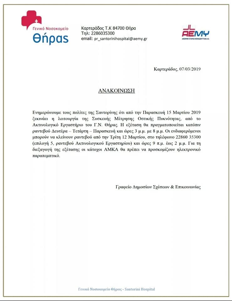 Ενημερώνουμε τους πολίτες της Σαντορίνης ότι από την Παρασκευή 15 Μαρτίου 2019 ξεκινάει η λειτουργία της Συσκευής Μέτρησης Οστικής Πυκνότητας, από το Ακτινολογικό Εργαστήριο του Γ.Ν. Θήρας. Η εξέταση θα πραγματοποιείται κατόπιν ραντεβού Δευτέρα – Τετάρτη – Παρασκευή και ώρες 3 μ.μ. με 8 μ.μ. Οι ενδιαφερόμενοι μπορούν να κλείνουν ραντεβού από την Τρίτη 12 Μαρτίου, στο τηλέφωνο 22860 35300 (επιλογή 5, ραντεβού Ακτινολογικού Εργαστηρίου) και ώρες 9 π.μ. έως 2 μ.μ. Για τη διεξαγωγή της εξέτασης οι κάτοχοι ΑΜΚΑ θα πρέπει να προσκομίζουν ηλεκτρονικό παραπεμπτικό.