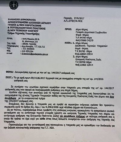 Γράφει συγκεκριμένα: “Σε συνέχεια του ανωτέρω σχετικού περιήλθαν στην Υπηρεσία μας στοιχεία της υπ’ αριθμόν 144/2017 απόφαση σας που αφορά σε κυκλοφοριακές ρυθμίσεις στα Φηρά Θήρας.
