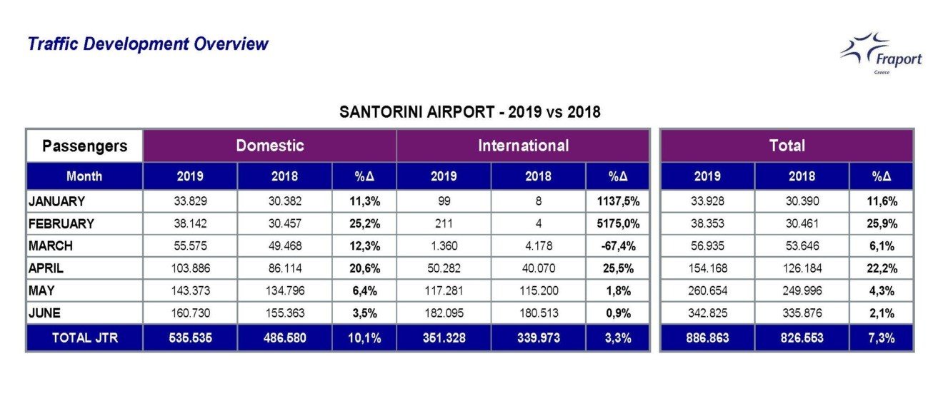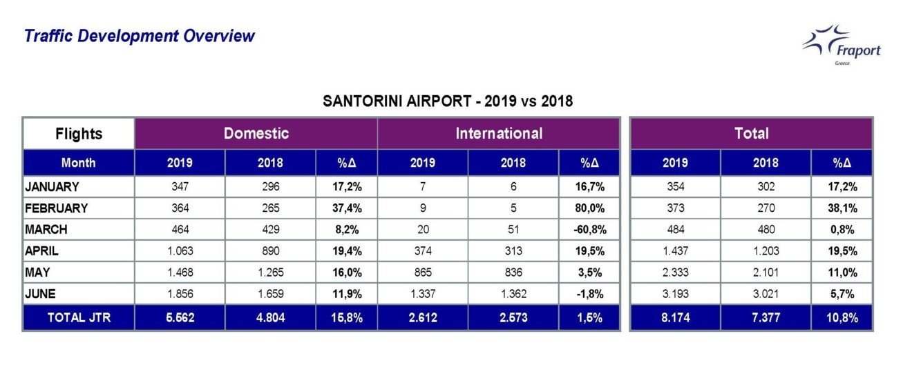 Σε σχέση με την προηγούμενη χρονιά, παρατηρείται αύξηση 10,1% στις πτήσεις εσωτερικού, 3,3% στις πτήσεις εξωτερικού, και 7,3% συνολικά.