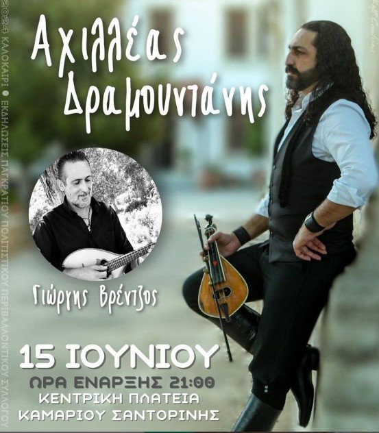 Ο «Παγκράτιος Περιβαλλοντικός και Πολιτιστικός Σύλλογος Καμαρίου» σας προσκαλεί το Σάββατο 15 Ιουνίου 2024 στην Κάναβα Ρούσσος στην Επισκοπή Γωνιά Θήρας και ώρα 21:00 να γλεντήσουμε μαζί στη ΜΟΥΣΙΚΗ ΚΡΗΤΙΚΗ ΒΡΑΔΙΑ ΜΕ ΤΟΥΣ ΑΧΙΛΛΕΑ ΔΡΑΜΟΥΝΤΑΝΗ ΚΑΙ ΓΙΩΡΓΗ ΒΡΕΝΤΖΟ , ΣΥΝΟΔΕΙΑ ΚΑΙ ΝΗΣΙΩΤΙΚΗΣ ΜΟΥΣΙΚΗΣ ΜΕ ΠΑΡΑΔΟΣΙΑΚΟ ΒΙΟΛΙ ΤΟΝ ΑΡΓΥΡΗ ΑΡΒΑΝΙΤΗ ΚΑΙ ΣΤΟ ΛΑΟΥΤΟ Ο ΒΑΓΓΕΛΗΣ ΣΧΟΙΝΑΣ – ΣΤΗΝ ΚΕΝΤΡΙΚΗ ΠΛΑΤΕΙΑ ΚΑΜΑΡΙΟΥ ΚΑΙ ΩΡΑ 21:00 ΜΕ ΕΛΕΥΘΕΡΗ ΕΙΣΟΔΟ.
