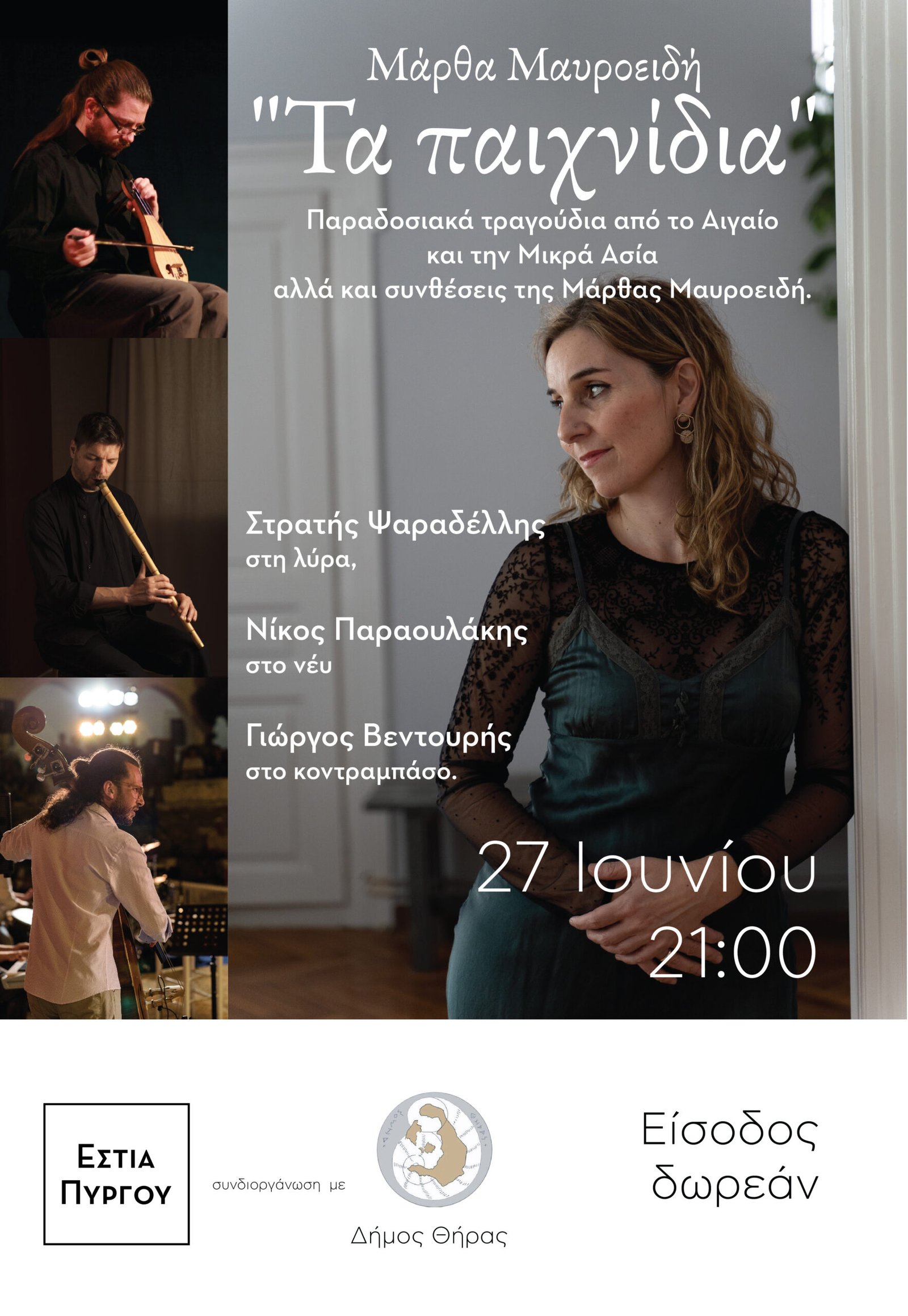 Afisa 1 (2) ΜΑΡΘΑ  “Η Εστία Πύργου και ο Δήμος Θήρας στις 27 Ιουνίου διοργανώνουν στην κεντρική πλατεία του Πύργου μουσική βραδιά με την Μάρθα Μαυροειδή με το σχήμα της. Θα παρουσιάσουν