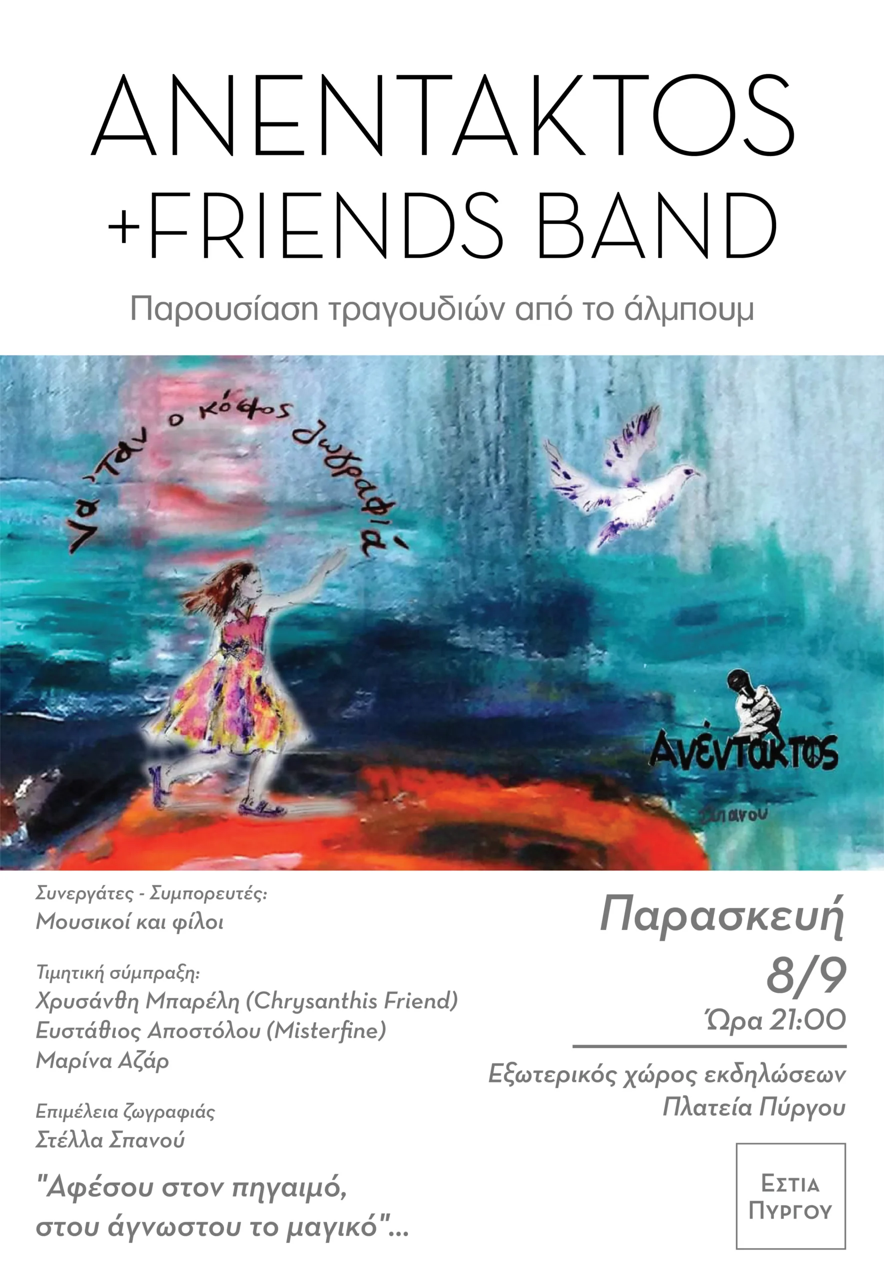 “Την Παρασκευή, 8 Σεπτεμβρίου 2023, ώρα 21.00 στην πλατεία Πύργου ο Χρήστος Φύτρος – Ανέντακτος & Friends band θα παρουσιάσει το μουσικό άλμπουμ ¨Να ‘ταν ο κόσμος ζωγραφιά¨.