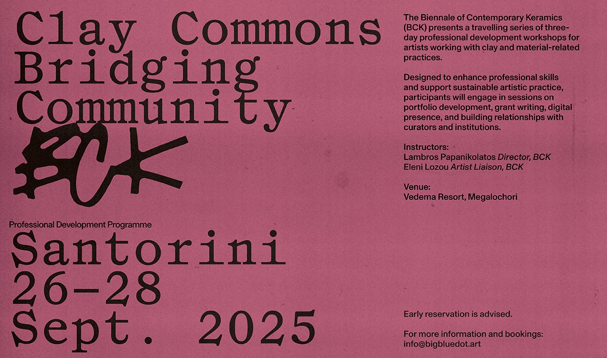 Στο πλαίσιο της δράσης “Clay Commons: Bridging Heritage, Innovation and Community” η Biennale of Contemporary Keramics (BCK) παρουσιάζει για πρώτη φορά ένα καινοτόμο, τριήμερο, εντατικό εργαστήριο επαγγελματικής ανάπτυξης, ειδικά σχεδιασμένο για καλλιτέχνες που εργάζονται με τον πηλό και άλλες χειροτεχνικές πρακτικές. Το πρόγραμμα προσφέρει βασικά εργαλεία για την υποστήριξη μιας σύγχρονης καλλιτεχνικής πορείας, γεφυρώνοντας την καλλιτεχνική δημιουργία με την επαγγελματική εξέλιξη, την πρόσβαση σε θεσμούς και τη δικτύωση με ευρύτερα πολιτιστικά οικοσυστήματα.