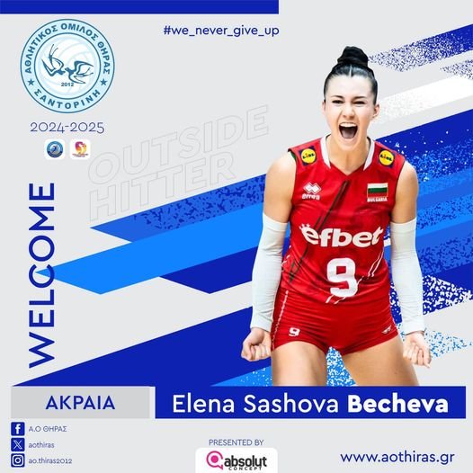 Ως διοίκηση του Α.Ο. Θήρας καλωσορίζουμε την Εlena Sashova Becheva και της ευχόμαστε μία αθλητική περίοδο με υγεία και κάθε επιτυχία στην εκπλήρωση των στόχων της”.