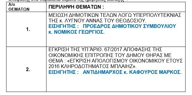 Ο Πρόεδρος του Δημοτικού Συμβουλίου του Δήμου Θήρας, σας καλεί να προσέλθετε στην τακτική δημόσια συνεδρίαση του δημοτικού Συμβουλίου που θα διεξαχθεί στην αίθουσα του ΔΑΠΠΟΣ την 14η του μηνός Ιουνίου 2017, ημέρα της εβδομάδας Τετάρτη και ώρα 18:00 για τη συζήτηση και λήψη απόφασης στα παρακάτω θέματα της ημερήσιας διάταξης :