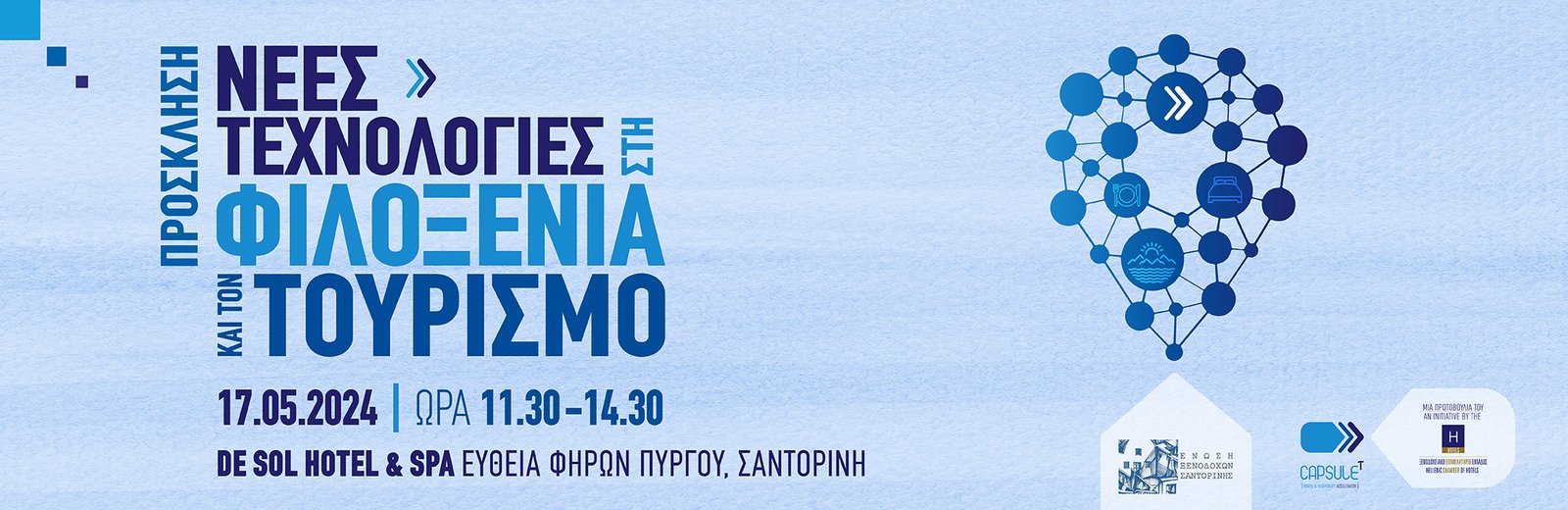 “Η Ένωση Ξενοδόχων Σαντορίνης και ο Επιταχυντής Νεοφυών Επιχειρήσεων του Ξενοδοχειακού Επιμελητηρίου Ελλάδος, CapsuleT Travel & Hospitality Accelerator συνδιοργανώνουν την εκδήλωση “Νέες Τεχνολογίες στη Φιλοξενία και τον Τουρισμό”, την Παρασκευή 17 Μαΐου στις 11.30 στο ξενοδοχείο De Sol.