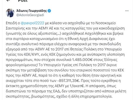 με κάλεσε να ασχοληθώ με το Νοσοκομείο Σαντορίνης και την ΑΕΜΥ ΑΕ και τις καταγγελίες του για κακοδιαχείριση (γνωστής σε όλους αξιοπιστίας…) ασχολήθηκα! Ασχολήθηκα και βρήκα στα συρτάρια καταχωνιασμένο ότι η Εθνική Αρχή Διαφάνειας έχει συντάξει αναλυτικό πόρισμα ελέγχου αναφορικά με την σκανδαλώδη εξαγορά από την ΑΕΜΥ ΑΕ το 2017 επί θητείας Πολάκη στο Υπουργείο Υγείας του ΚΕΚ/ΚΨΥ, ενός ΚΕΚ ζημιογόνου και με ανύπαρκτη υλοποίηση προγραμμάτων, που στοίχισε συνολικά 1.485.000€ στους Έλληνες φορολογούμενους!