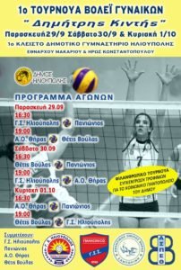 Συνεχίζονται οι προετοιμασίες για το 1ο τουρνουά Δημήτρης Κιντής φιλανθρωπικού χαρακτήρα, που θα διοργανώσει το τμήμα βόλεϊ γυναικών το 3ήμερο 29-30/9 και 1/10 στο Α” κλειστό γυμναστήριο Ηλιούπολης.