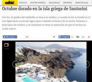 “Με 25 βαθμούς θερμοκρασία το μεσημέρι αναζητάς τη σκιά και όταν ο ήλιος βυθίζεται στο Αιγαίο μια ελαφριά ζακέτα είναι αρκετή για τη δροσιά της νύχτας . Στις αρχές Οκτώβρη στη Σαντορίνη, έχεις την αίσθηση ότι το καλοκαίρι δεν τελειώνει ποτέ”, γράφει το Λατινοαμερικάνικο δίκτυο ABC Color, σε αφιέρωμά του για το νησί. Μαζί με ένα μπουκέτο όμορφων φωτογραφιών, ο συντάκτης, τονίζει πως η απουσία μεγάλου πλήθους στους δρόμους, αποτελεί ένα μεγάλο κίνητρο για να επισκεφτεί κάποιος τη Σαντορίνη τον Οκτώβρη.