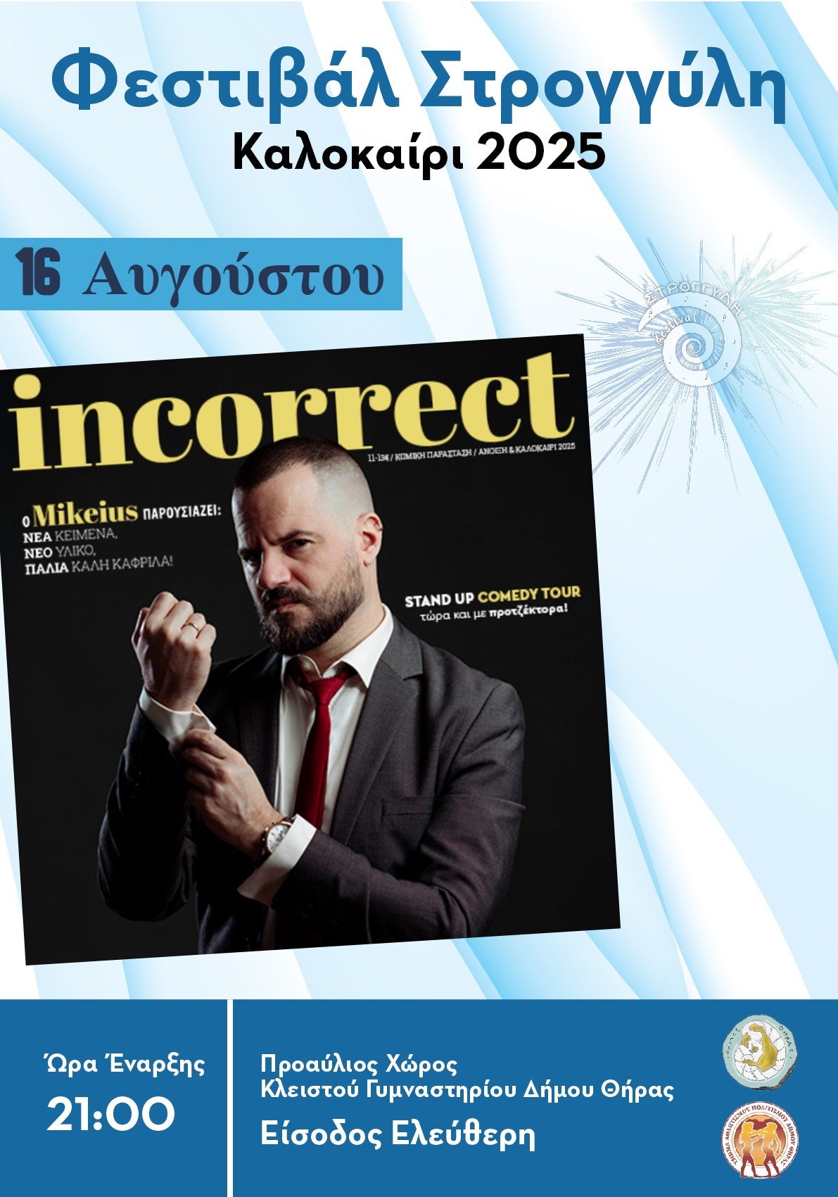 Στην φετινή του παράσταση με τίτλο «Incorrect», ο Mikeius φέρνει νέα κείμενα, νέες σκέψεις και ιστορίες, έχοντας απέναντι έναν πλανήτη που μέρα με τη μέρα βρίσκεται κόντρα στις ίδιες τις επιλογές του περί πολιτικής ορθότητας.