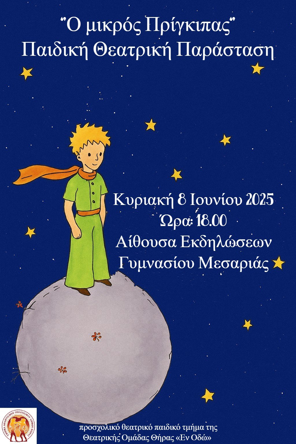 Το προσχολικό θεατρικό παιδικό τμήμα της Θεατρικής Ομάδας Θήρας «Εν Οδώ» σε συνεργασία με το Τμήμα Αθλητισμού και Πολιτισμού του Δήμου Θήρας σας προσκαλούν σε μια μαγική παράσταση βασισμένη στο αγαπημένο έργο του Antoine de Saint-Exupéry την Κυριακή 8 Ιουνίου 2025 στις 18:00, στην Αίθουσα Εκδηλώσεων του Γυμνασίου Μεσαριάς.