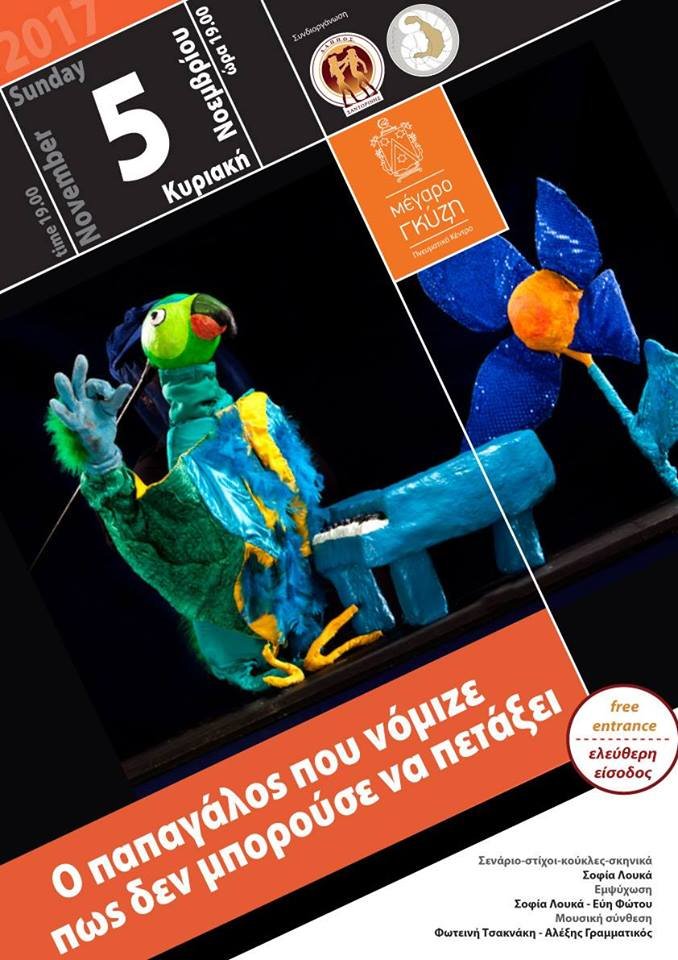“Ο Δημοτικός Αθλητικός Πολιτιστικός Περιβαλλοντικός Οργανισμός Σαντορίνης, ο Δήμος Θήρας και το Πνευματικό Κέντρο Μέγαρο Γκύζη στα πλαίσια των πολιτιστικών τους εκδηλώσεων σας προσκαλούν την Κυριακή 5 Νοεμβρίου 2017 στις 19:00 στο Μέγαρο Γκύζη για να παρακολουθήσετε την παράσταση «Ο παπαγάλος που νόμιζε πως δεν μπορούσε να πετάξει».