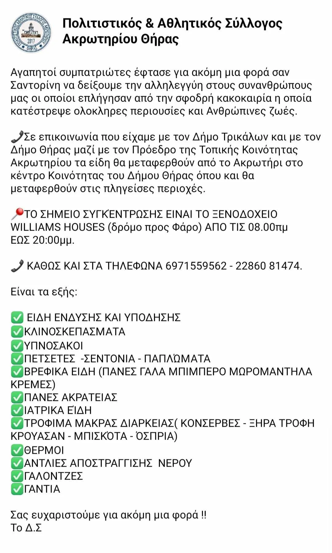 Ο Πολιτιστικός Σύλλογος Ακρωτηρίου συλλέγει βοήθεια για τους πλημμυροπαθείς
