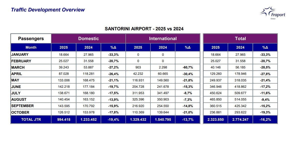 “Ο αερολιμένας Σαντορίνης εξακολουθεί να ασκεί σημαντική επίδραση στη συνολική απόδοση του δικτύου της Fraport Greece, καταγράφοντας περίπου 56.000 λιγότερους επιβάτες τον Οκτώβριο σε σύγκριση με την ίδια περίοδο πέρυσι, ποσοστό που αντιστοιχεί σε -19,3%.