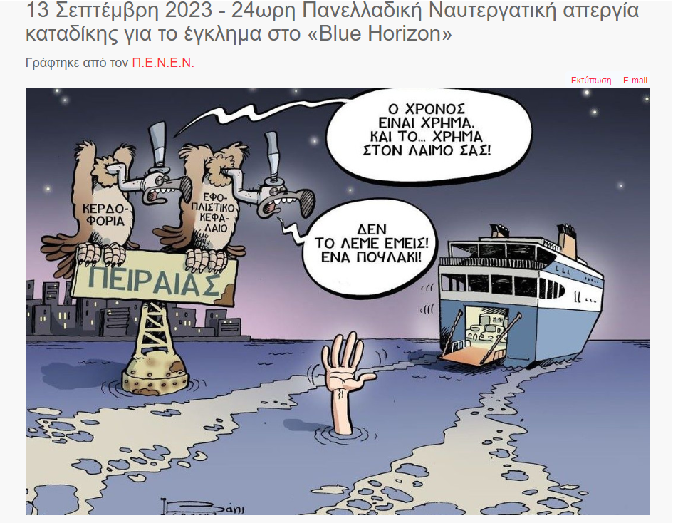 Ταυτόχρονα καταγγείλαμε την εταιρία «Blue Star Ferries» όπως και όλες εκείνες τις εταιρίες που συστηματικά και επαναλαμβανόμενα παραβιάζουν την ισχύουσα νομοθεσία θέτοντας σε κίνδυνο την ασφάλεια των επιβατών, των Ναυτεργατών και των ίδιων των πλοίων!