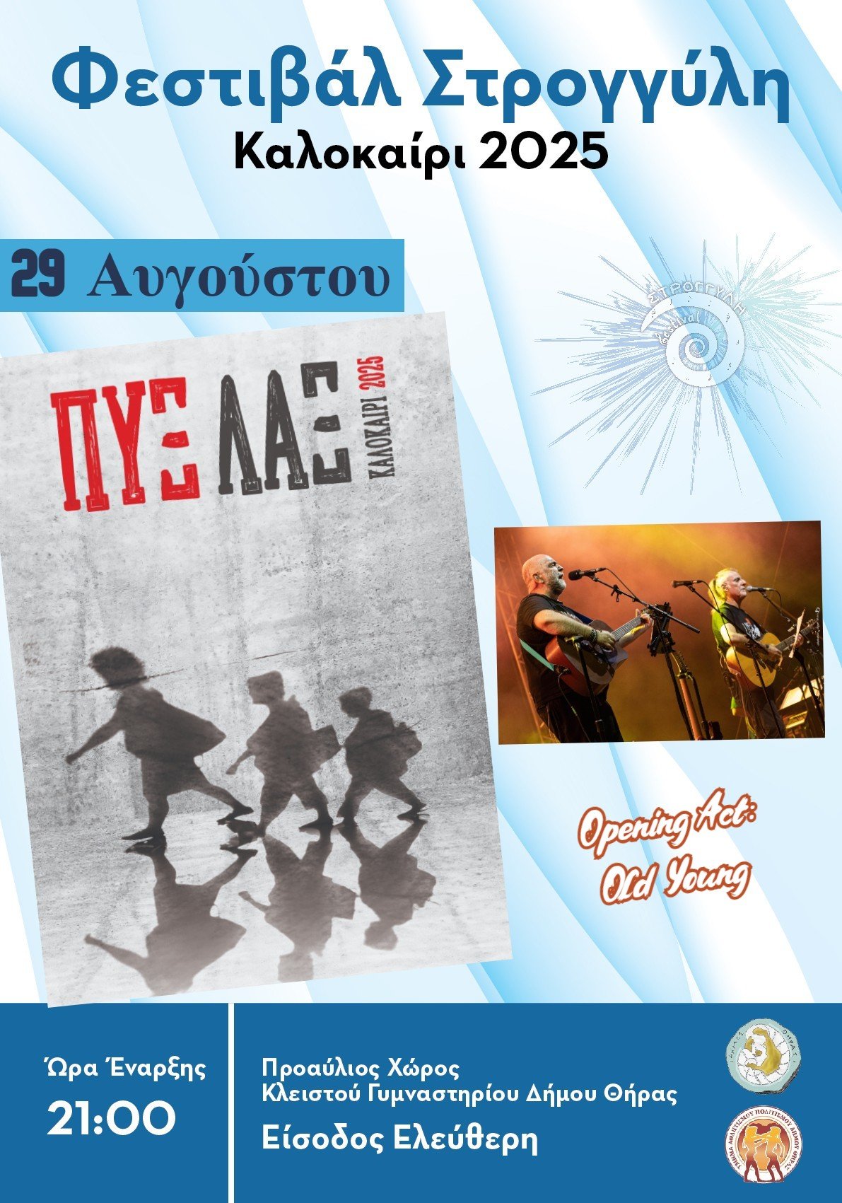 “Οι Πυξ Λαξ, το θρυλικό συγκρότημα που έπαιξε καθοριστικό ρόλο στην ελληνική μουσική σκηνή, έρχονται για να δονήσουν ξανά τις καρδιές μας στο «8ο Φεστιβάλ Στρογγύλη» την Παρασκευή 29 Αυγούστου 2025 στις 21:00 στον Προαύλιο Χώρο του Κλειστού Γυμναστηρίου Δήμου Θήρας.
