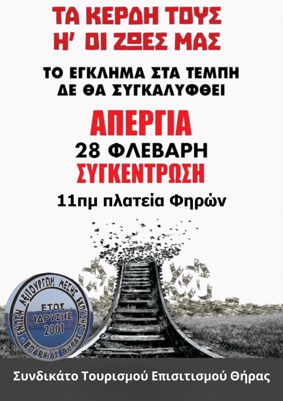 Ο σύλλογος εργαζομένων Επαρχίας Θήρας, η ΕΛΜΕ Θήρας και το συνδικάτο επισιτισμού τουρισμού Επαρχίας Θήρας απευθύνουμε κάλεσμα σε όλους τους εργαζόμενους, αυτοαπασχολούμενους, αγρότες, νέους και νέες να συμμετέχουν μαζικά στην απεργία στις 28 Φεβρουαρίου, ημέρα που κλείνουν 2 χρόνια από το κρατικό έγκλημα στα Τέμπη. Δίνουμε την μάχη μαζί με Εργατικά Κέντρα, Ομοσπονδίες και συνδικάτα, με τους εργαζόμενους από όλους τους κλάδους ώστε να υπάρξει πραγματική δικαίωση, να αποδοθούν όλες οι πολιτικές και ποινικές ευθύνες για το έγκλημα των Τεμπών.