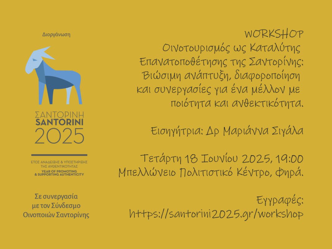“Ο Δήμος Θήρας, στο πλαίσιο της πρωτοβουλίας «Σαντορίνη 2025: Έτος Ανάδειξης και Υποστήριξης της Αυθεντικότητας», και σε συνεργασία με τον Σύνδεσμο Οινοποιών Σαντορίνης, διοργανώνει workshop με τίτλο: