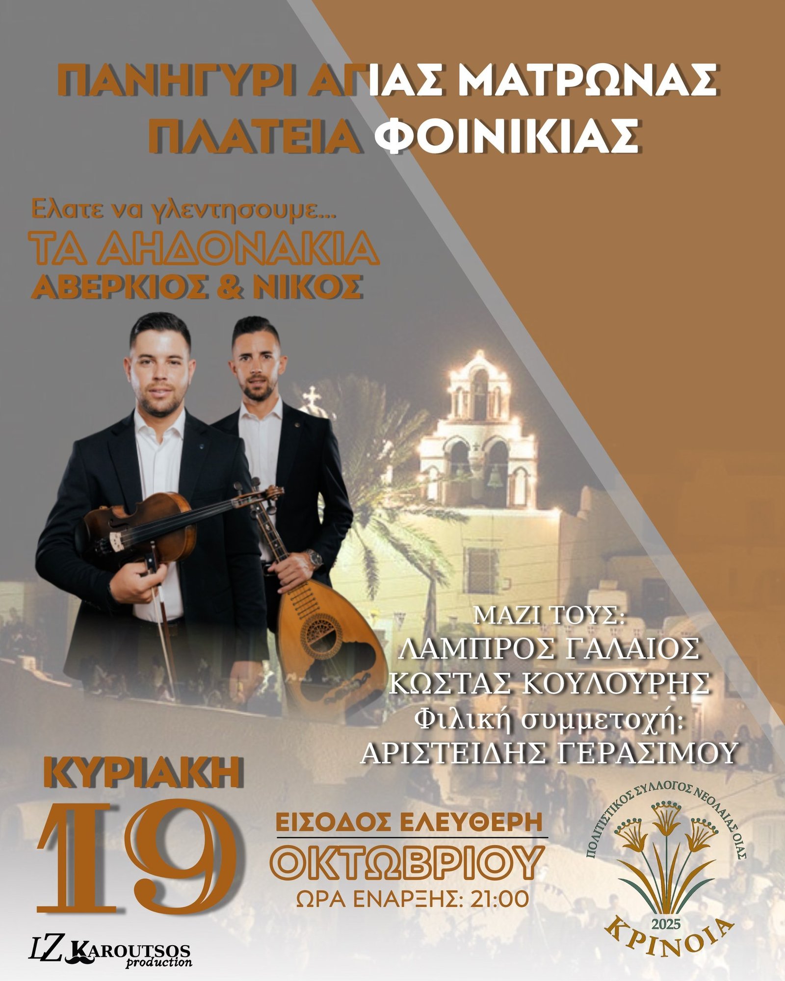 Ο Πολιτιστικός Σύλλογος Νεολαίας Οίας “Η ΚΡΙΝΟΙΑ” προσκαλεί όλους τους πολίτες και τα μέλη του χωριού στο πανηγύρι μας, που θα πραγματοποιηθεί τη Κυριακή 19 Οκτωβρίου στην πλατεία της Φοινικιάς !
