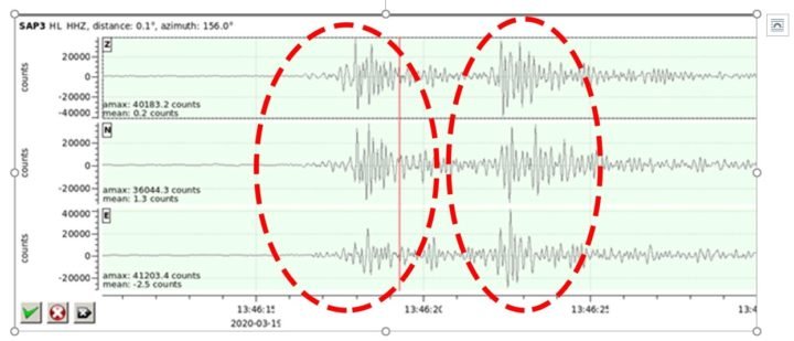 Σχήμα 1. Καταγραφή «εκρήξεων» που έγιναν αισθητές στη Σαντορίνη στις 15:46 τοπική ώρα (13:46 GMT) στο σταθμό SAP3 στη Θηρασιά