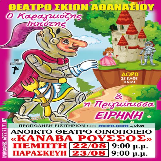 “ΣΑΝΤΟΡΙΝΗ, ΠΕΜΠΤΗ ΚΑΙ ΠΑΡΑΣΚΕΥΗ 22 ΚΑΙ 23 ΑΥΓΟΥΣΤΟΥ, στο ΑΝΟΙΚΤΟ ΘΕΑΤΡΟ ΚΑΝΑΒΑ ΡΟΥΣΣΟΣ παράσταση στις 9:00μ.μ.Το έργο με τίτλο «Ο Καραγκιόζης Ιππότης» αγκαλιάζει το Βρετανικό παραμύθι. Ο ξυπόλητος ήρωάς μας, καλείται μαζί με όλους τους φίλους του να ξεπεράσει τους φόβους του, να τους φωτίσει και να βρει την Πριγκίπισσα Ειρήνη με τη βοήθεια του μάγου Μέρλιν”.