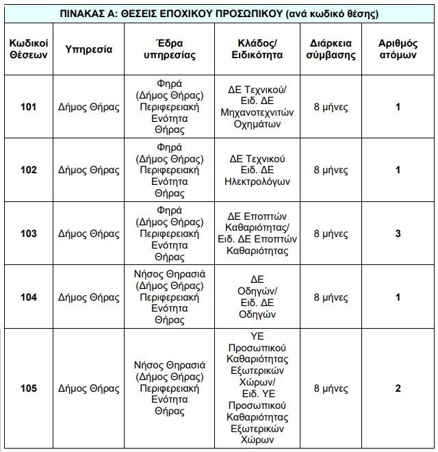 “Ο Δήμος Θήρας προκηρύσσει συνολικά οκτώ (8) θέσεις εποχικού προσωπικού με σύμβαση ιδιωτικού δικαίου ορισμένου χρόνου, διάρκειας οκτώ (8) μηνών, για την κάλυψη αναγκών ανταποδοτικού χαρακτήρα.
