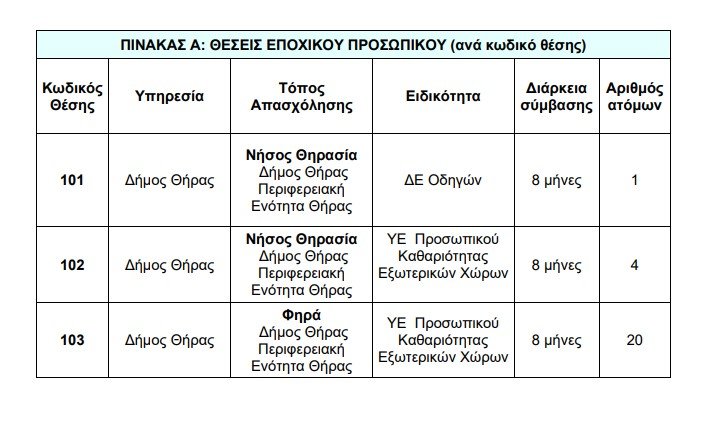 “Την πρόσληψη, με σύμβαση εργασίας ιδιωτικού δικαίου ορισμένου χρόνου, συνολικά είκοσι πέντε (25) ατόμων για την κάλυψη αναγκών ανταποδοτικού χαρακτήρα στο Δήμο Θήρας, που εδρεύει στα Φηρά της Περιφερειακής Ενότητας Θήρας, και συγκεκριμένα τους εξής, ανά υπηρεσία, τόπος απασχόλησης, ειδικότητα και διάρκεια σύμβασης, αριθμού ατόμων (βλ. ΠΙΝΑΚΑ Α), με τα αντίστοιχα απαιτούμενα (τυπικά και τυχόν πρόσθετα) προσόντα: