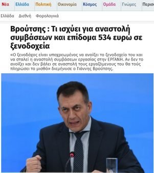 «Ο ξενοδόχος είναι υποχρεωμένος να ανοίξει το ξενοδοχείο του και να σταλεί η αναστολή συμβάσεων εργασίας στην ΕΡΓΑΝΗ. Αν δεν το ανοίξει και δεν βάλει σε αναστολή τους εργαζόμενους του, θα τους πληρώσει το μισθό» διεμήνυσε ο υπουργός. Καλύπτονται και οι εργαζόμενοι και στα λεωφορεία του τουρισμού, διευκρίνισε ο κ. Βρούτσης”.