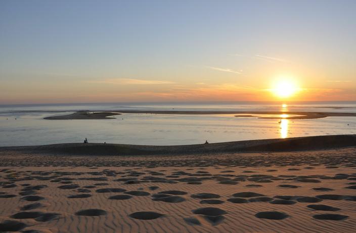 Cette dune de sable, sans doute la plus belle de France, elle est sans conteste la plus haute d’Europe. Et l’un de nos sites les plus enchanteurs pour savourer l’explosion lumineuse des dernières minutes du jour. Au sommet des 102 m de haut, à l’orée du massif forestier des Landes de Gascogne, avec le banc d’Arguin et l’Atlantique en toile de fond, on est comme suspendu entre ciel et forêt. Au coucher du soleil, le ciel se teinte de couleurs chaudes et dorées, et le sable rosit.