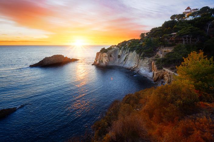 Astre rouge sur la Grande Bleue au parc national des calanques, Bouches-du-Rhône (France)