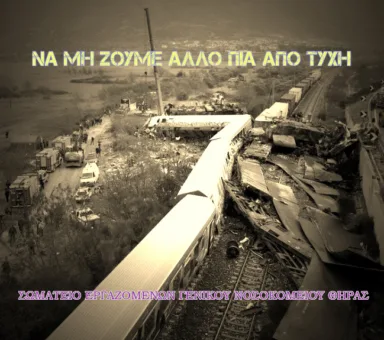 “Το Σωματείο Εργαζομένων του Γενικού Νοσοκομείου Θήρας συμμετέχει στην 24ωρη πανελλαδική απεργία που προκηρύχθηκε από τη ΓΣΕΕ και την ΑΔΕΔΥ για τις 16 Μαρτίου 2023 και στην κινητοποίηση που θα πραγματοποιηθεί στην Πλατεία των Φηρών την ίδια μέρα στις 11.30, μετά το πολύνεκρο δυστύχημα στα Τέμπη, που κόστισε τη ζωή σε πάνω από 57 ανθρώπους.