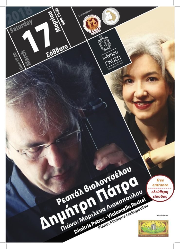 Ο Δημοτικός Αθλητικός Πολιτιστικός Περιβαλλοντικός Οργανισμός Σαντορίνης, ο Δήμος Θήρας και το Πνευματικό Κέντρο Μέγαρο Γκύζη στα πλαίσια των πολιτιστικών τους εκδηλώσεων σας προσκαλούν το Σάββατο 17 Μαρτίου 2018 στις 19:00 στο Μέγαρο Γκύζη για να παρακολουθήσετε ένα μοναδικό ρεσιτάλ βιολοντσέλου με τον Δημήτρη Πάτρα.