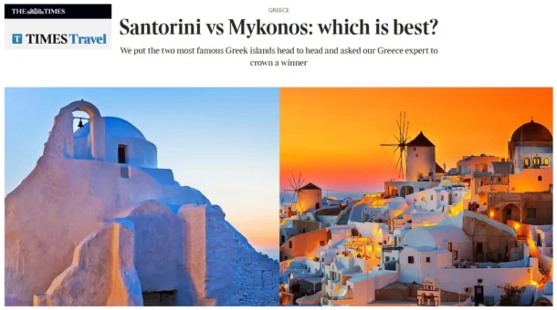 Στη συγκριτική αξιολόγηση της Σαντορίνης και της Μυκόνου, προχώρησαν με ειδικό δημοσίευμα τους οι Times του Λονδίνου. Ο ταξιδιωτικός συντάκτης της ιστορικής βρετανικής εφημερίδας συνέκρινε 5 πεδία τουριστικής προσφοράς.