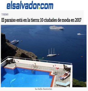 Είναι φυσικά αμφίβολο, το πόσους τουρίστες μπορεί να προσδοκά η Σαντορίνη από το μικρό (6,38 εκατομμύρια κάτοικοι), φτωχό και μακρινό Ελ Σαλβαντόρ της Κεντρικής Αμερικής, αλλά το γεγονός πως το συγκεκριμένο άρθρο, αποτελεί αναδημοσίευση των διεθνών τουριστικών τάσεων του 2017, προερχόμενων από τα διεθνή ειδησεογραφικά πρακτορεία, έχει κάποια σημασία. Σύμφωνα λοιπόν με την -ισπανόγλωσση- έκδοση elsalvador.com, η Σαντορίνη περιλαμβάνεται στους σημαντικότερους δυναμικούς προορισμούς του 2017. Σύμφωνα λοιπόν με τις μετρήσεις του διαδικτυακού κολοσσού “Skyscanner”, που αναδημοσιεύει η εφημερίδα, η Σαντορίνη βρίσκεται πολύ ψηλά στην πρώτη δεκάδα των φετινών ελκυστικών προορισμών.