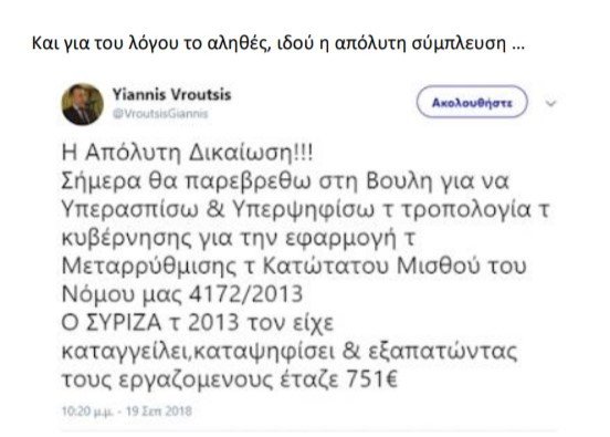 Να του θυμίσουμε επίσης ότι το Σεπτέμβριο 2018, μαζί με όλα τα κόμματα της Βουλής (ΣΥΡΙΖΑ, ΝΔ, ΚΙΝΑΛ, ΑΝΕΛ, Ένωση Κεντρώων και το παρών του Ποταμιού και της ναζιστικής Χρυσής Αυγής) υπερψήφισαν – εκτός από το ΚΚΕ –το νόμο «Βρούτση – Αχτσιόγλου» που προβλέπει ότι ο κατώτατος μισθός θα καθορίζεται από τον εκάστοτε υπουργό Εργασίας, δηλαδή από το αστικό κράτος, μετά από διαβούλευση με τους …«κοινωνικούς εταίρους», τους βιομήχανους κ.λπ., και με κριτήριο την ενίσχυση της «ανταγωνιστικότητας», δηλαδή την κερδοφορία των επιχειρηματικών ομίλων.