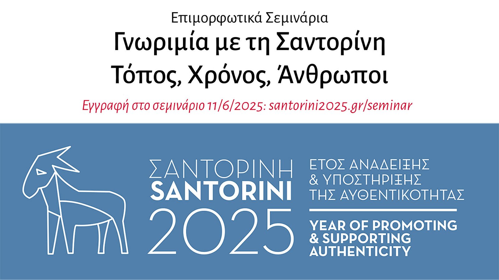 “Ο Δήμος Θήρας στο πλαίσιο της πρωτοβουλίας «Σαντορίνη 2025: Έτος Ανάδειξης και Υποστήριξης της Αυθεντικότητας» διοργανώνει μια σειρά επιμορφωτικών σεμιναρίων με τίτλο: