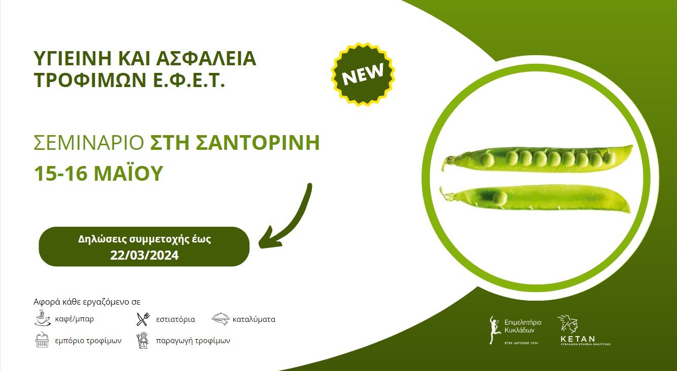 Tο Επιμελητήριο Κυκλάδων ανακοινώνει τη διεξαγωγή σεμιναρίου Υγιεινής & Ασφάλειας Τροφίμων (Ε.Φ.Ε.Τ.) τον Μάιο στη Σαντορίνη. Προκειμένου να εξασφαλίσετε έγκαιρα τη θέση συμμετοχής σας στο επόμενο τμήμα παρακαλούμε να λάβετε υπόψη την καταληκτική ημερομηνία υποβολής αιτήσεων: