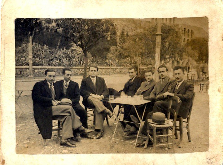 “25/12/1935. Σικινιώτες φίλοι πίνουν τα ουζάκια τους, στην Διονυσίου Αρεοπαγίτου,