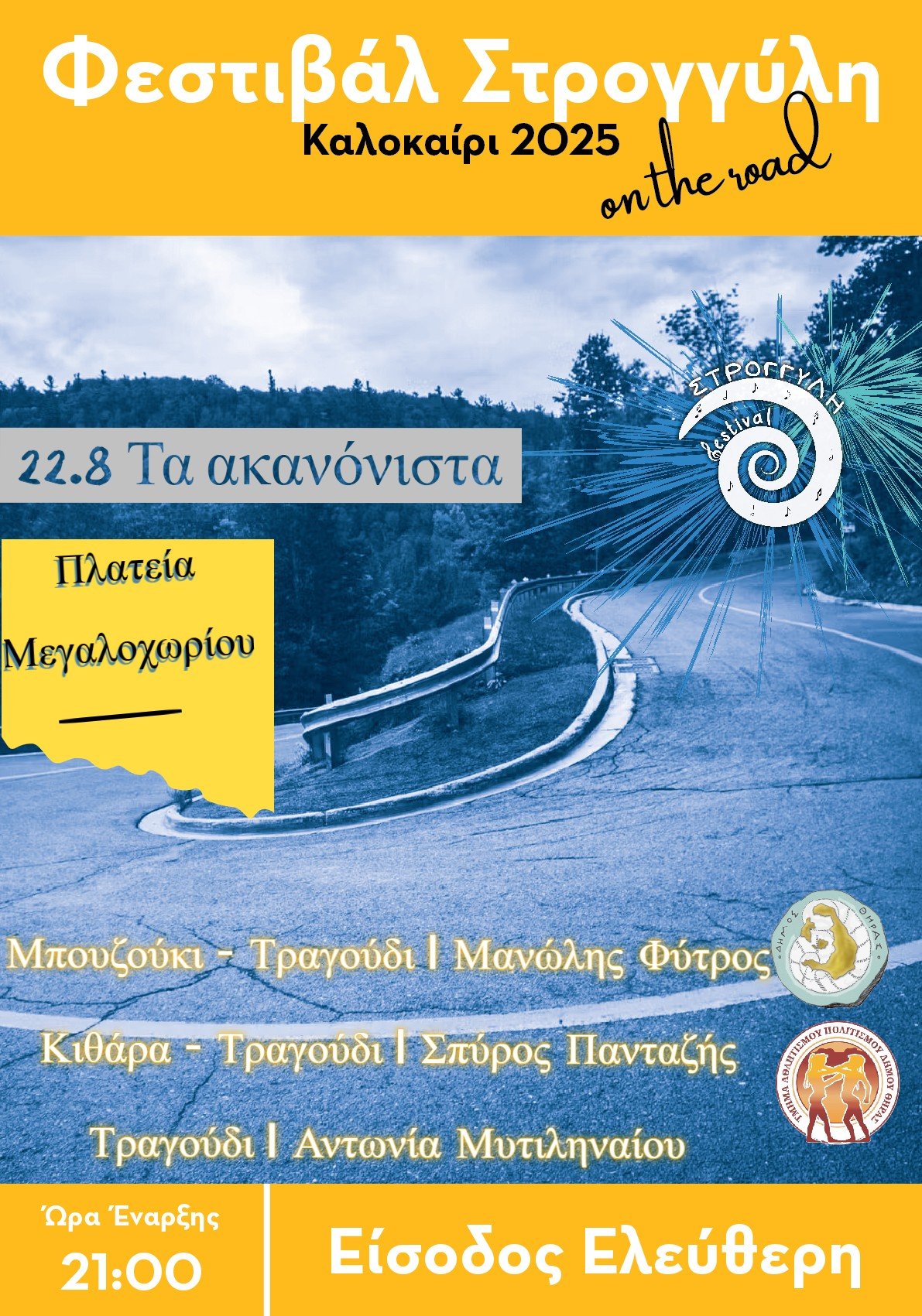 “Την Παρασκευή 22 Αυγούστου 2025 στις 21:00 η Κεντρική Πλατεία του Μεγαλοχωρίου θα φιλοξενήσει τη μουσική παράσταση «Τα ακανόνιστα» στο πλαίσιο του «Φεστιβάλ Στρογγύλη On The Road».