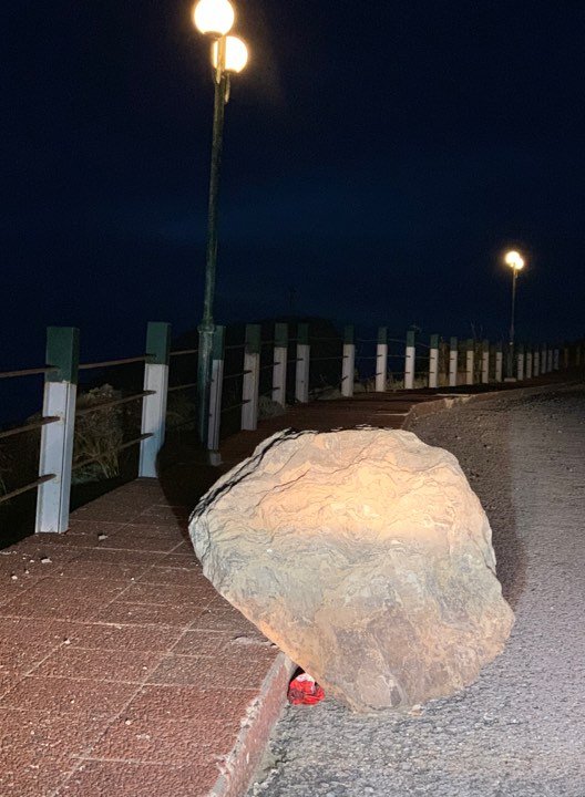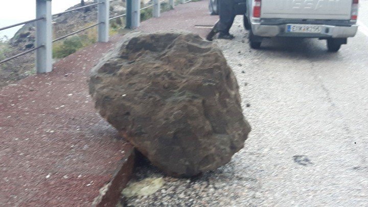 Πριν 10 μέρες, κατέπεσε στο δρόμο προς το Αμμούδι της Οίας, ένας βράχος. Είναι ακόμα εκεί. Στον ίδιο δρόμο, υπήρξε κατακρήμνιση και άλλων μικρότερων βράχων ή απλώς φερτών υλικών. Πάλι εκεί, είναι.