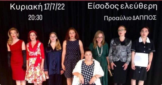 H ‘Θεατρική Ομάδα Θήρας Εν Οδώ”, του σκηνοθέτη Αντώνη Γάκη, σας παρουσιάζει με τιμή, την εμβληματική μαύρη κωμωδία του Ρόμπερ Τομά , 8 Γυναίκες Κατηγορούνται την Κυριακή 17 Ιουλίου 2022, στισ 20:30 στο προαύλιο του ΔΑΠΠΟΣ ,στον Καρτεραδο. Ένα έργο σταθμός για τη θέση της γυναίκας σε μια πατριαρχική οικογένεια.