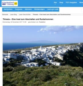 Το αφιέρωμα του Glismann, συνοδεύεται από πολλές φωτογραφίες, αλλά και μια λεπτομερή ξενάγηση στους ορμίσκους, τα εστιατόρια και τα χωριά του νησιού. “Κύριες βιομηχανίες είναι η καλλιέργεια οίνου και λαχανικών και η επιχείρηση με τους τουρίστες της Σαντορίνης. Κάτι το οποίο είναι επίσης πολύ ευχάριστο, είναι το ότι δεν υπάρχει αστυνομία στο νησί. Οι Θηρασιώτες το βλέπουν και γι αυτό – το 99% των αυτοκινήτων του νησιού είναι χωρίς πινακίδες”, γράφει με μεγάλη δόση υπερβολής.