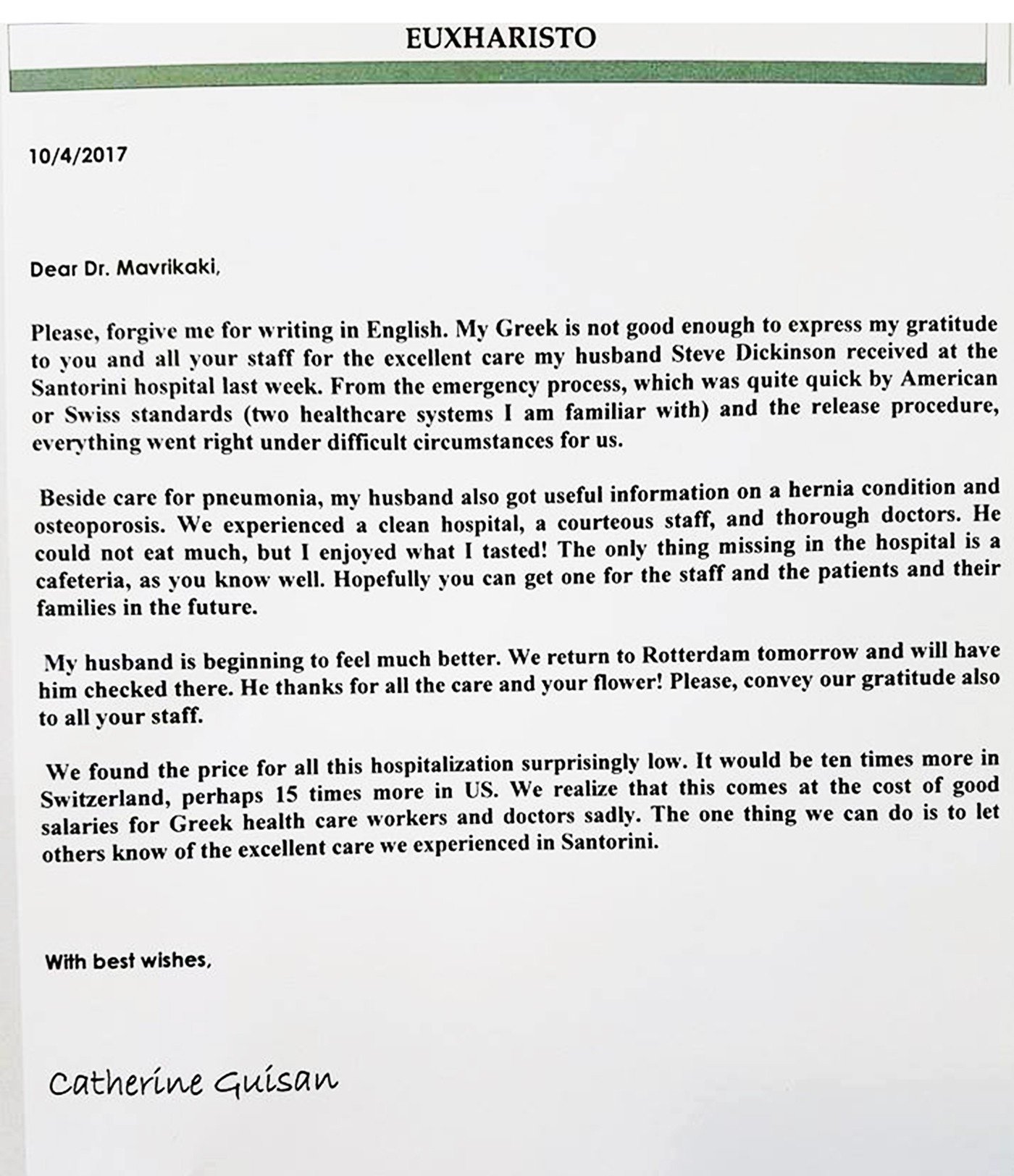 Παρακαλώ συγχωρήστε με που σας γράφω στα αγγλικά. Τα ελληνικά μου δεν είναι επαρκή για να εκφράσω την ευγνωμοσύνη μου, σε σας και τους συνεργάτες σας, για την εξαιρετική φροντίδα που ο σύζυγός μου, Στηβ Ντίκινσον, έλαβε στο Νοσοκομείο Σαντορίνης, την τελευταία εβδομάδα. Από τα Επείγοντα Περιστατικά, που είναι πολύ ταχύτερα από τα Αμερικανικά ή Ελβετικά στάνταρντ (δύο συστήματα υγείας που μου είναι οικεία) και τη διαδικασία διεκπεραίωσης, όλα πήγαν ορθά, κάτω από τις δύσκολες για εμάς, συνθήκες.