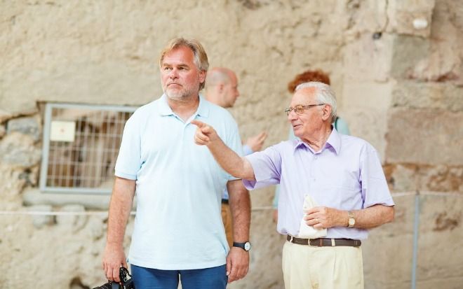 Ο καθηγητής Χρίστος Ντούμας ενώ ξεναγεί τον Εβγκένι Κασπέρσκι στο Ακρωτήρι |