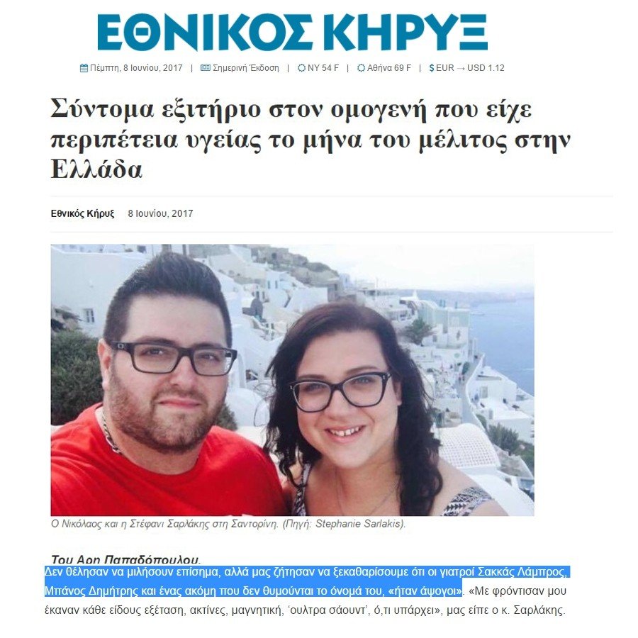 Και συνεχίζει: “Το «μυστήριο» λύθηκε όταν γνωρίσαμε τον ασθενή και την σύζυγό του Στέφανι. Μαζί τους και ο πατέρας του Νικόλαου, ιερέας Δημήτριος Σαρλάκης, ο οποίος ιερουργεί στο Γουίνιπεγκ.