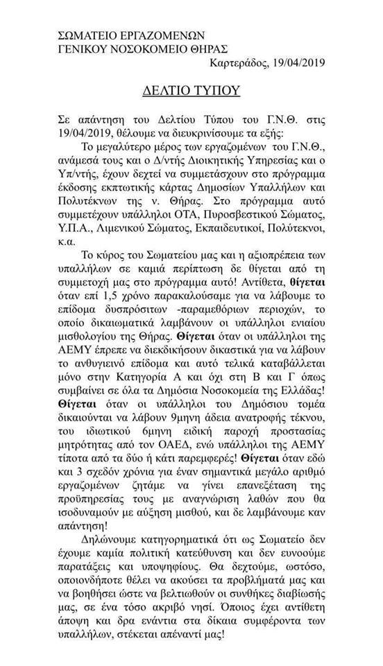 Δημοσιεύουμε, μια ανακοίνωση του Σωματείου Εργαζομένων του Γενικού Νοσοκομείου Θήρας. Θα ακολουθήσει και η απάντηση της Διοίκησης. Αφορμή μάλλον υπήρξε προηγουμενη ανακοίνωση της Διοίκησης με τίτλο: ”