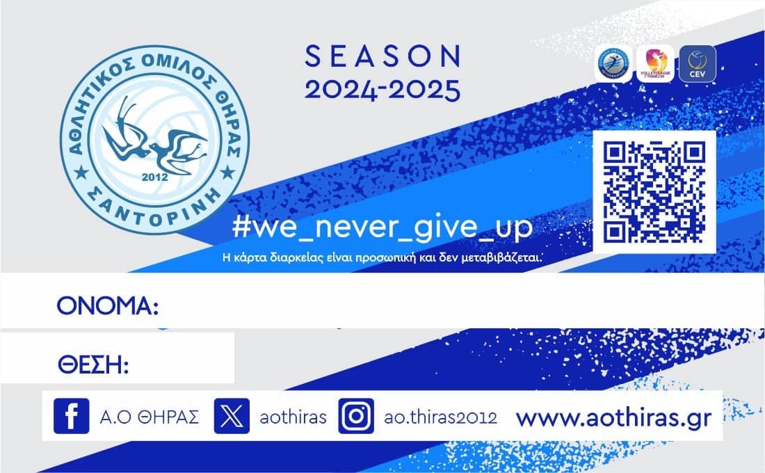 “Ο Αθλητικός Όμιλος Θήρας ανακοινώνει με ενθουσιασμό την έναρξη της διάθεσης των εισιτηρίων διαρκείας για την αγωνιστική περίοδο 2024-2025 από σήμερα. Τα εισιτήρια διαρκείας εξασφαλίζουν τη θέση σας σε όλους τους εντός έδρας αγώνες του ελληνικού πρωταθλήματος, του κυπέλλου Ελλάδας και των ευρωπαϊκών διοργανώσεων.
