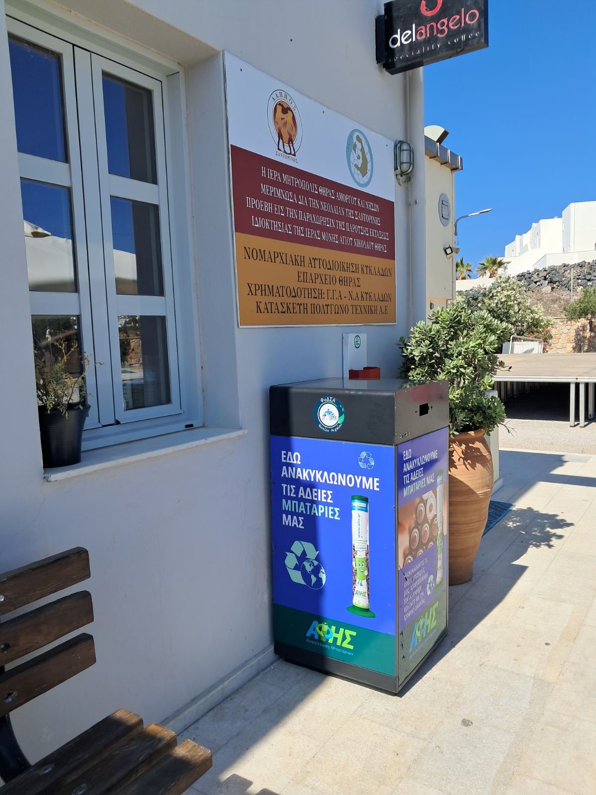 Batteries  “Ο Δήμος Θήρας ανακοινώνει την τοποθέτηση 2 νέων μεταλλικών κάδων κατάλληλων για την ανακύκλωση μπαταριών. Οι κάδοι είναι χωρητικότητας 120 λίτρων ο καθένας και έχουν τοποθετηθεί ο ένας στο Δάππος και ο δεύτερος στο Εμπορείο, δίπλα από το ΑΤΜ.