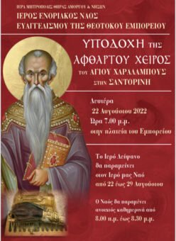 “Μέ πολλή χαρά ἡ Ἱερά Μητρόπολη Θήρας, Ἀμοργοῦ & Νήσων πρόκειται νά ὑποδεχθεῖ στίς 22 Αὐγούστου καί ὥρα 19:00, στόν Ἱερό Ἐνοριακό Ναό Εὐαγγελισμοῦ τῆς Θεοτόκου Ἐμπορείου τό ἄφθαρτο χέρι τοῦ Ἁγίου ἐνδόξου ἱερομάρτυρος Χαραλάμπους, προστάτου ἐκ τῶν λοιμικῶν ἀσθενειῶν.